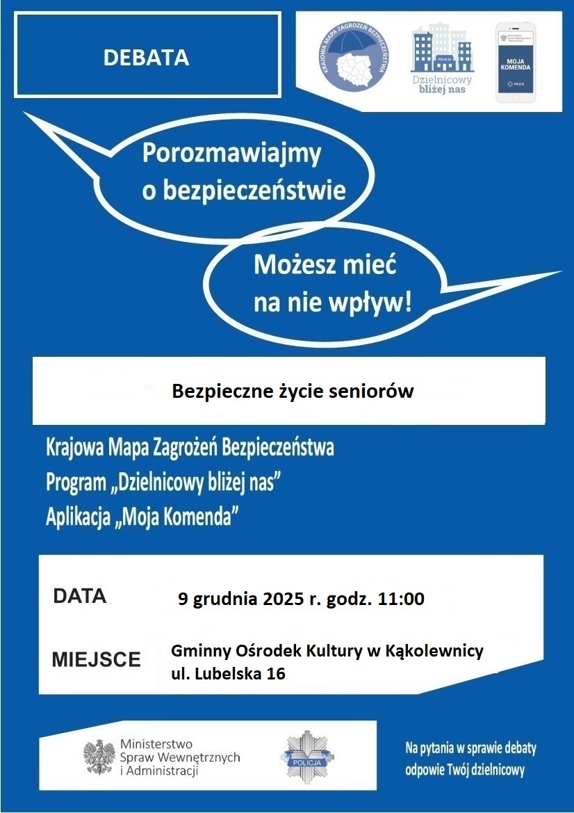 Komendant Powiatowy Policji w Radzyniu Podlaskim zaprasza mieszkańców gminy Kąkolewnica na otwartą debatę społeczną pod hasłem "Bezpieczne życie seniorów". Debata odbędzie się w dniu 9 grudnia 2025 roku o godz. 11:00 w Gminnym Ośrodku Kultury w Kąkolewnicy przy ulicy Lubelskiej 16.